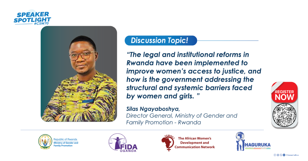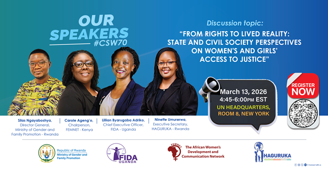 Into that global conversation steps HAGURUKA, alongside the Ministry of Gender and Family Promotion of Rwanda (MIGEPROF), FIDA Uganda, and the Feminist Africa Network (FEMNET). Together, they are convening a 75-minute side event titled: Justice for Her: Power, Policy, and Practice Across the East African Region.
