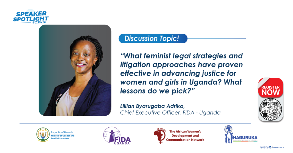 FIDA Uganda will share what feminist legal strategies and litigation approaches have proven effective in advancing justice for women and girls in Uganda, including best practices such as strategic litigation, investment in community justice systems and collaboration with ministries and the judiciary, intersectionality and how these play out — not leaving anyone behind (young people, persons with disabilities, and other minorities) , lessons learnt on engaging men and boys as allies, and strengthened collaboration with like-minded actors at national and regional levels.