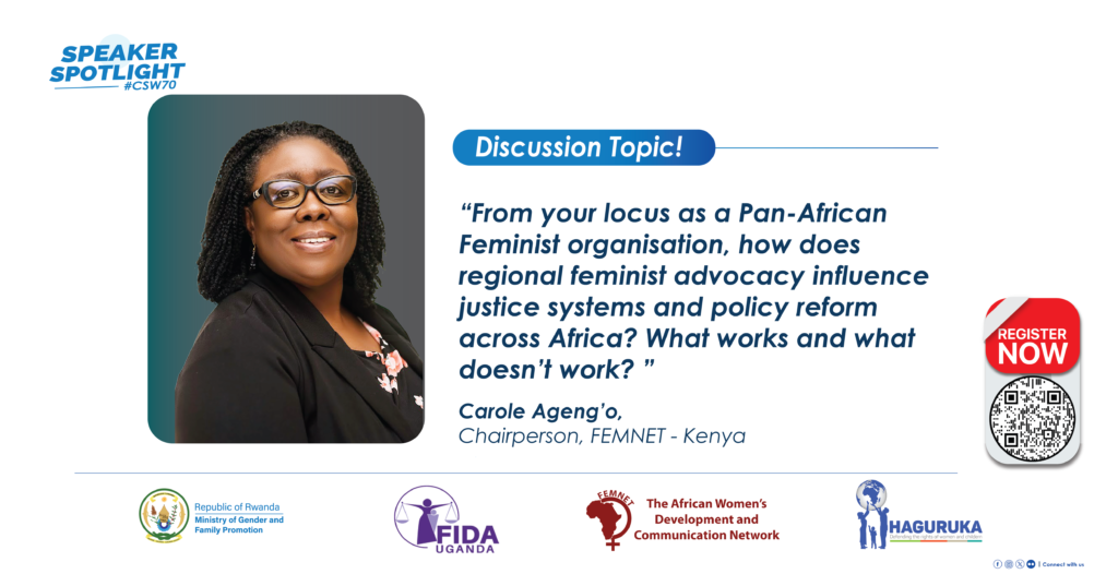 FEMNET will examine, from its locus as a Pan-African feminist organisation, how regional feminist advocacy influences justice systems and policy reform across Africa — looking at legal advancements in the East African Region, access to justice from legal and administrative perspectives, and the work of Court Users Committees in Kenya, among others.